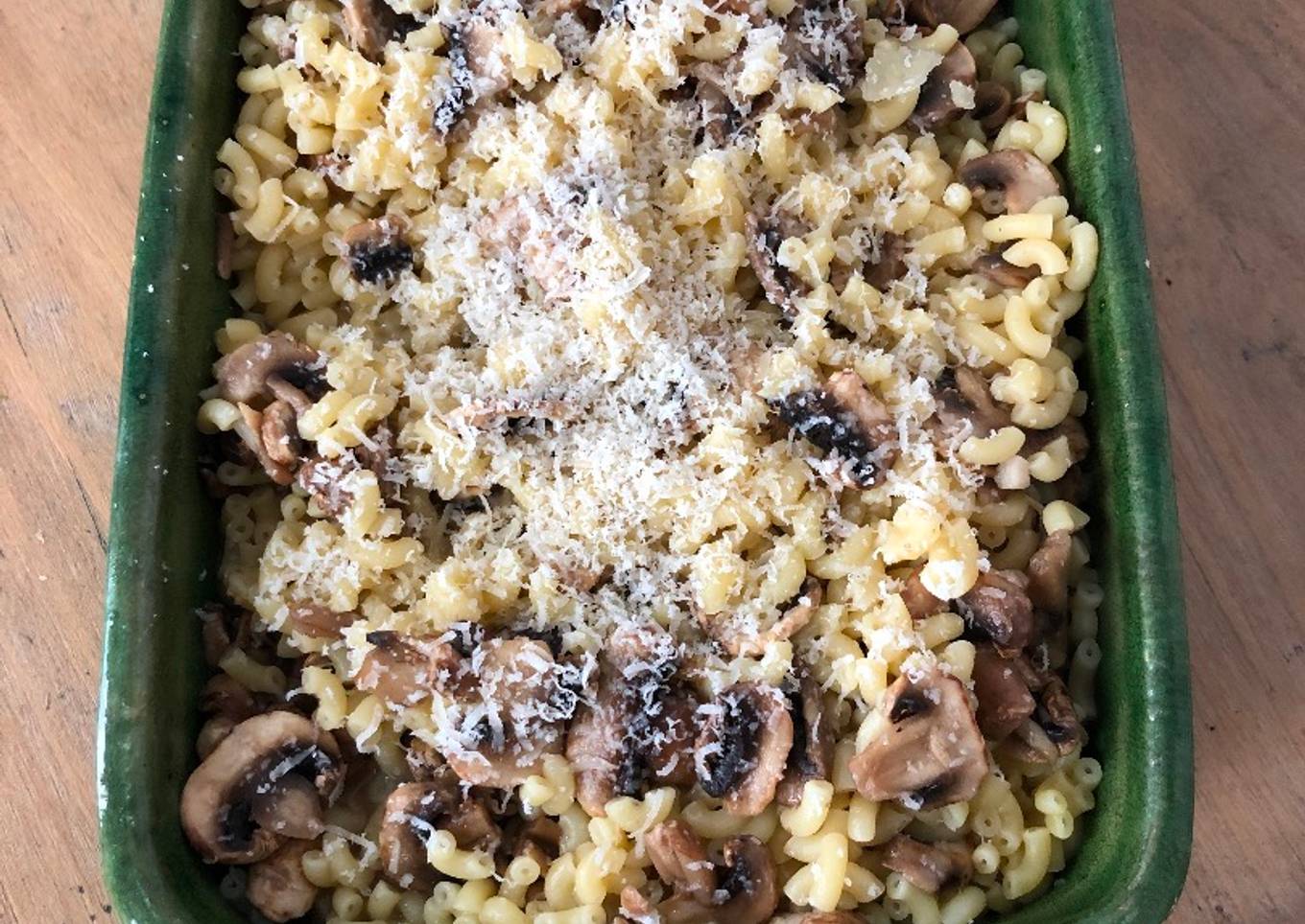 - Mélanger les champignons et la sauce béchamel, verser le mélange sur les pâtes. Ajouter sel et poivre, puis le parmesan rapé et enfourner 20 minutes environ.
