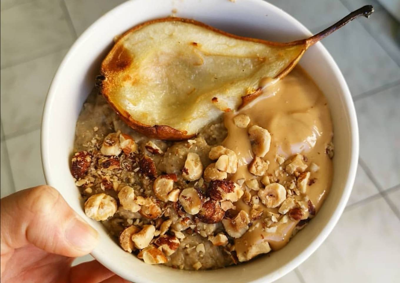 Porridge healthy poire peanut butter et noisettes