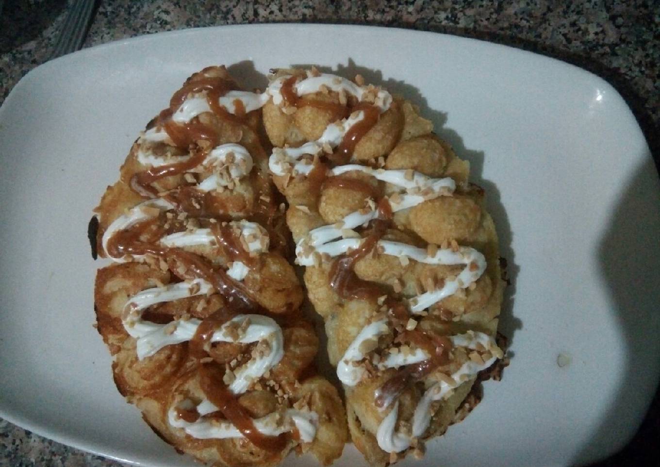 - Plier la crêpe en deux, et décorer par la sauce toffin, la crème chantilly et les cacahuètes.