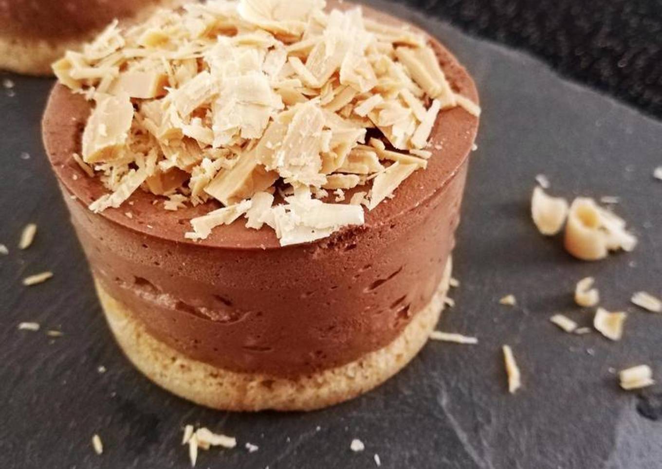 Entremet individuel,dacquoise noisette, mousse au chocolat noir et copeaux Dulcey