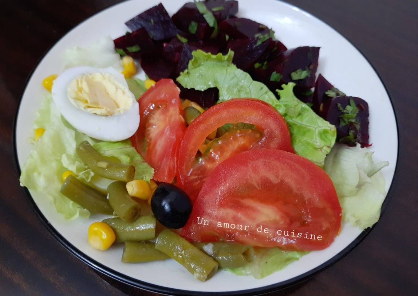 - Il ne reste que rassembler les légumes coupés dans une assiette plate ensuite agrémentez de persil ciselé, maïs, olives noires, œufs durs et assaisonnez ensuite réservez au frais.