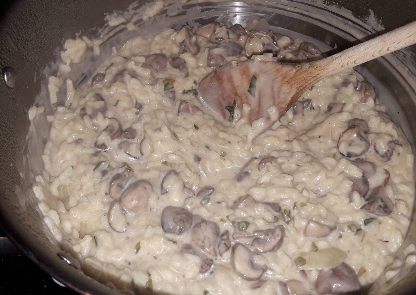 - Une fois le riz prêt, on ajoute nos champignons à la crème et le parmesan. On laisse un peu sans remuer (environ 2 minutes) puis on remue énergiquement le tout. C'est prêt, bon appétit !!!